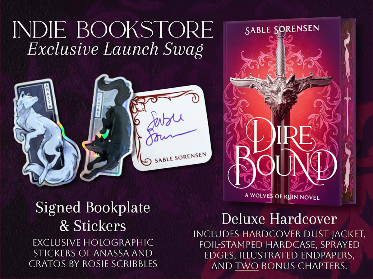 Receive exclusive holographic stickers of Anassa and Cratos, art by Rosie Scribbles and a signed bookplate when you order the Dire Bound deluxe hardcover from the following bookstores. While supplies last!